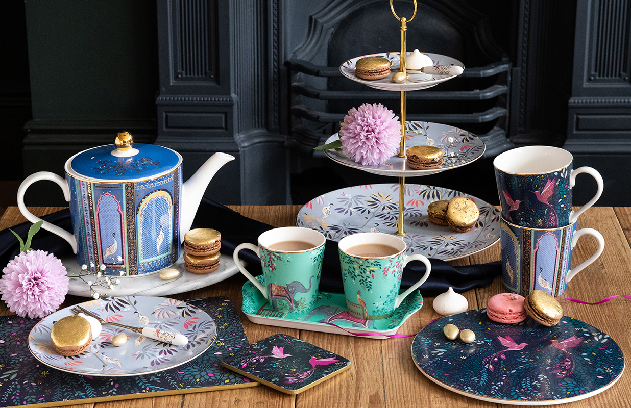 Дизайн коллекции вдохновлён путешествиями Сары в Индию, Марокко, Египет и другие страны. В палитре преобладают цвета драгоценных камней — изумрудный, сапфировый, фуксия. Завораживающие рисунки с павлинами, фламинго, жирафами и леопардами воспевают красоту экзотической природы. В коллекцию входят кружки, чайник, этажерка и тарелки для трендовой сервировки чайного стола в эклектичном стиле.