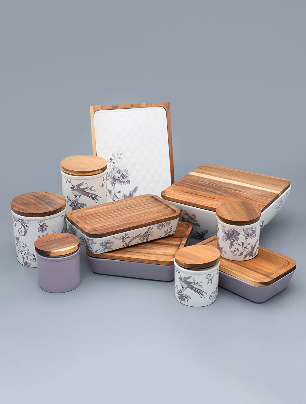 - Одна форма украшена рисунками в стиле шинуазри, вторая монохромная форма выполнена в чернильно-фиолетовом оттенке и поддерживает цветовую гамму рисунка.